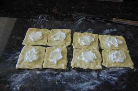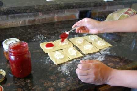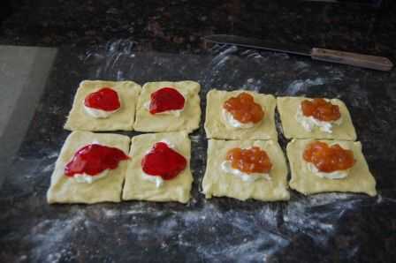 Con una cuchara de algunos ordenar, sacar un poco de queso crema y colocar en medio de su plaza. Una vez hecho esto, coge algunos jalea y la porción sobre el queso crema! Cualquier tipo de jalea funcionaría, pero como he mencionado anteriormente, como el albaricoque, frambuesa también es buena. Nasty simplemente de la uva, personalmente. Y no te olvides de precalentar el horno a 375 grados F.