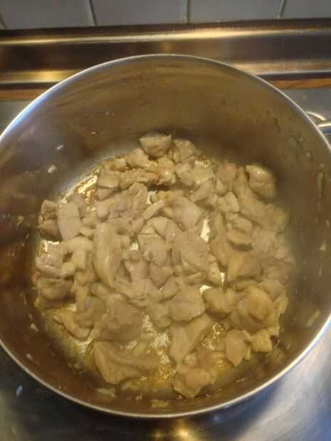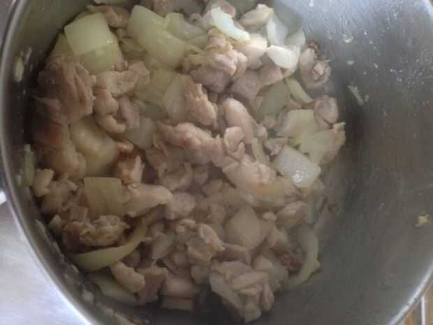 Ha! Aquí puede ver que las piezas de pollo son más pequeñas. He cortarlas otra vez en trozos pequeños... Medio camino a través del proceso de cocción echar la cebolla en cubos y cocine a fuego lento hasta que las cebollas estén la mitad hecho.