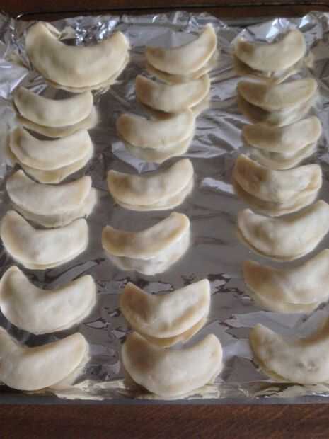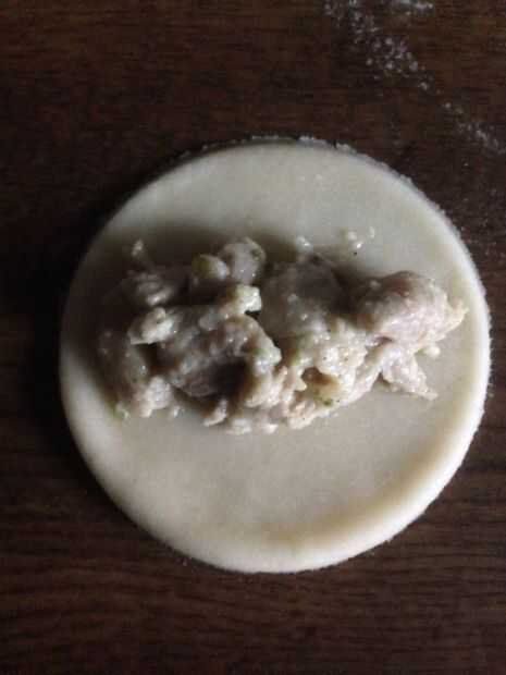 Estirar la masa, usando una taza o un vaso cortar pequeñas rondas, mantener el pollo relleno en el centro y doblar en dos y presionan juntos. No es necesario aplicar huevo alrededor de los bordes a pegar. Utilizar las manos darles forma para formar una luna :)