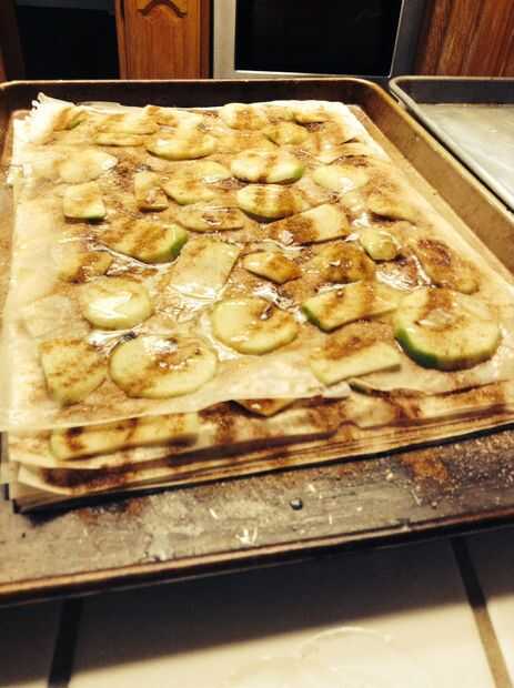 Precalentar el horno a 350F. Uso "Fillo pasta" por "Simbad" para hacer las capas, primero debe mantequilla el pan que optó por utilizar. Poner 3-4 hojas de la masa sobre la bandeja, luego pintar la parte superior de la masa con mantequilla. Siguiente espolvorear con azúcar y canela luego coloque las manzanas delgadas en la parte superior, repetir este proceso hasta que toda la masa. Cuando haya terminado debe parecerse la foto de arriba. Luego poner la masa en el horno durante unos 15 minutos hasta marrón de oro y lo saca del horno y lo deje reposar hasta enfriar. ¡ Disfrute!