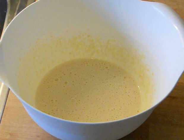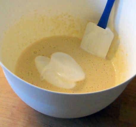 6. Agregue la mantequilla derretida. Mezcla más fácil si vierte un chorro fino en la mezcla como mezcla, por lo que incorpora como toque la mezcla de huevo.