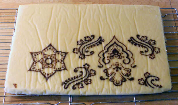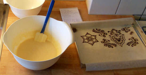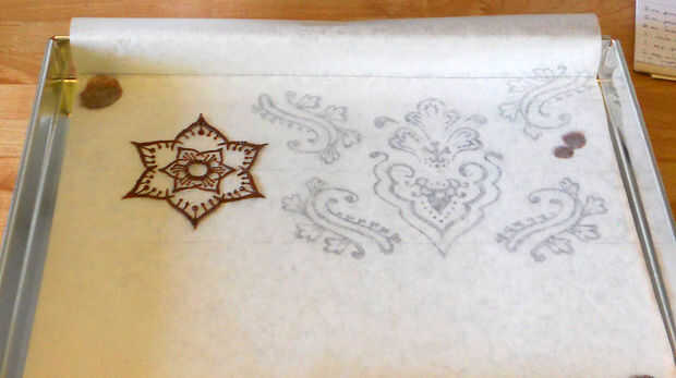 2. poner poco de pasta en una manga pastelera y tubo su diseño, utilizando los dibujos de lápiz como guía.