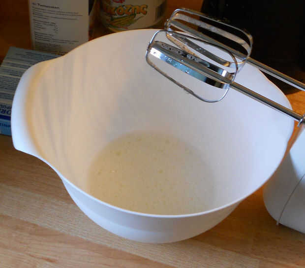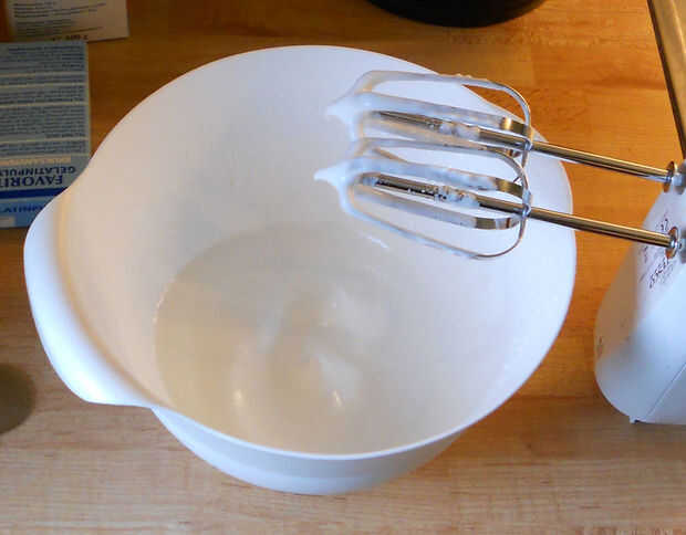 4. bata las claras de huevo con el azúcar hasta que se formen picos suaves.