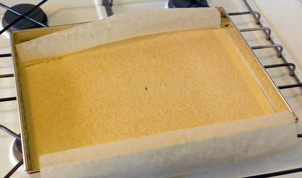 1. polvo de harina en la parte superior de la esponja y luego invertir en una placa para horno forrada con papel pergamino.
