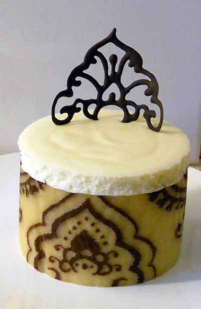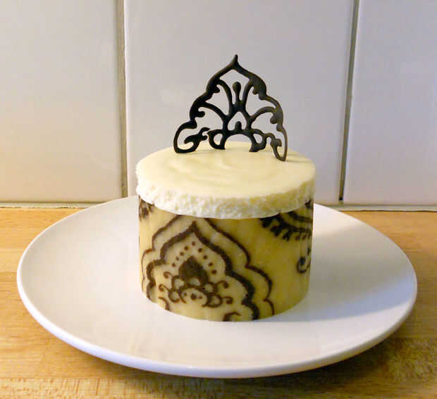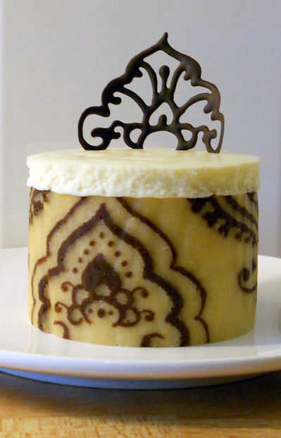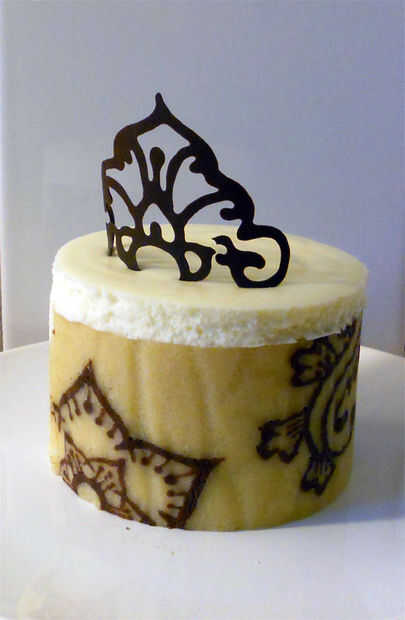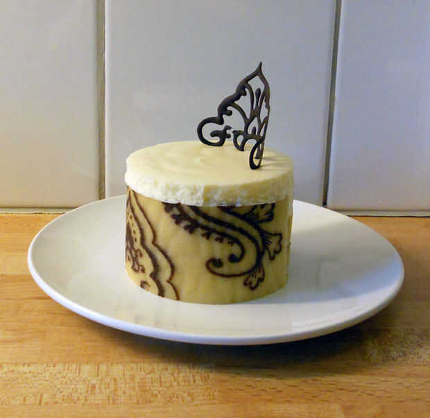 esta tarta contiene una base de tarta galleta de chispas de chocolate suave, delicioso, relleno con un mousse de chocolate sedoso y rematado con una esponjosa crema batida. En la parte superior del pastel, son delicado chocolate pi en forma de carame