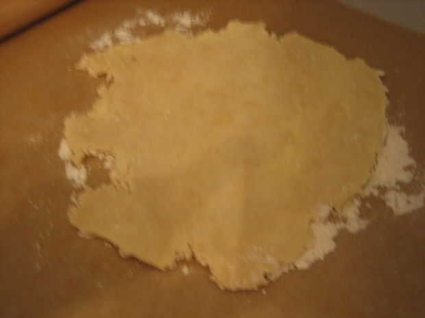 3. Coloque la masa en el centro de la superficie de trabajo y el rodillo desde el centro hacia afuera para formar una hoja sobre un ocho de pulgada de grosor (o hasta un cuarto, pero más delgado es mejor)