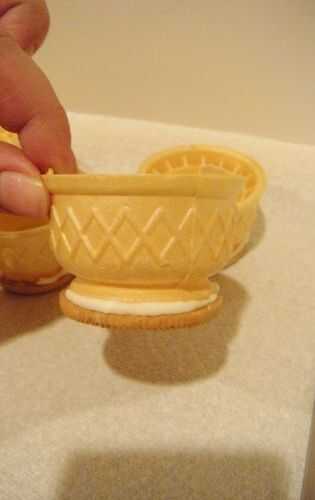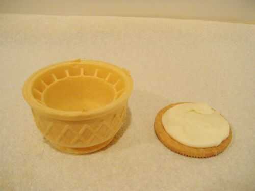 1. Tomar la taza de helado de antes y la galleta de helado la mitad y les pegan. El glaseado actuará como una especie de pegamento y mantener el cono a la base de galleta. Así se forma una taza!