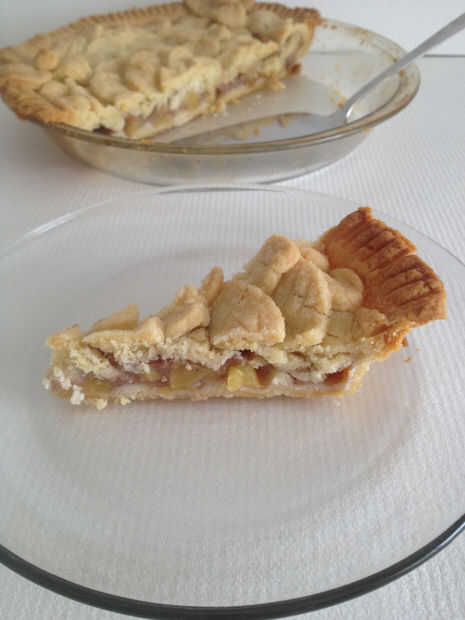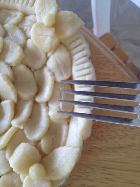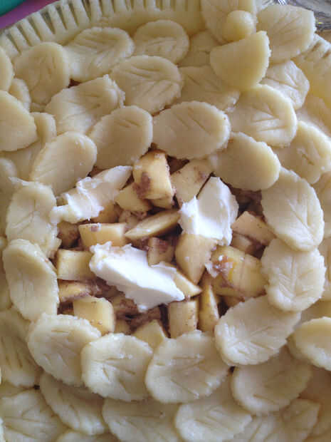 Sacar la corteza de la nevera. Cuchara de relleno en preparado de la corteza, da mantequilla aquí y allá, luego la superficie de la cubierta con corte de las hojas. Enfriar durante 15 minutos (o cuando se está precalentando el horno)