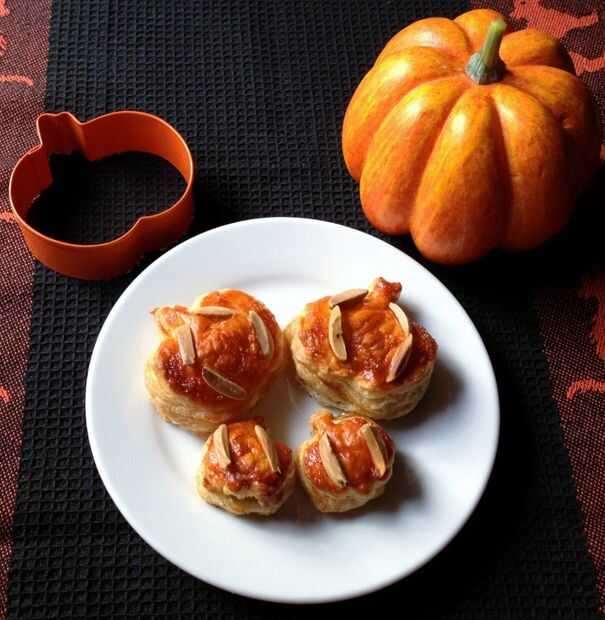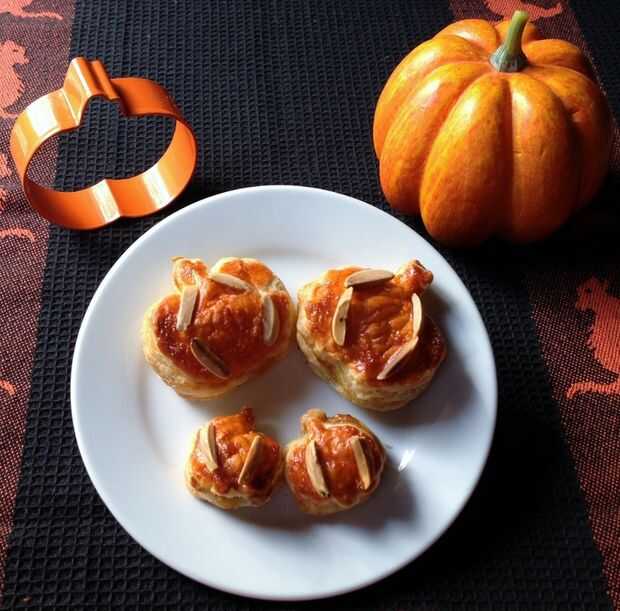 Hice dos tamaños diferentes, usted está limitado solamente por los cortadores de galletas que tienes! Una hoja de hojaldre rindió 6 bocados más grandes y 10 pastelitos de calabaza un bocado.