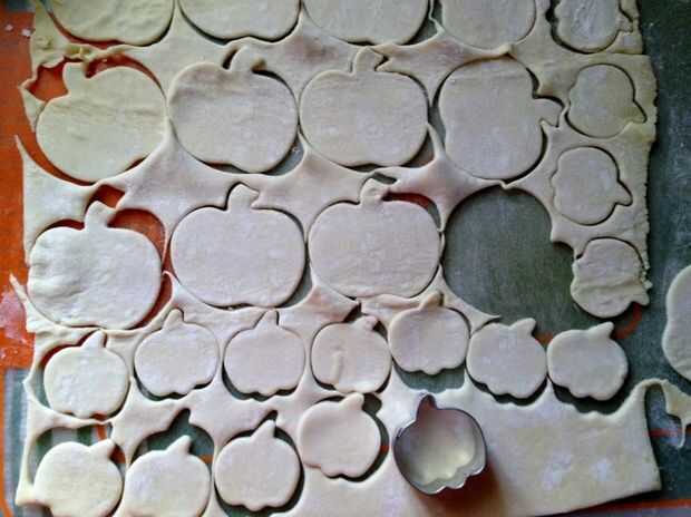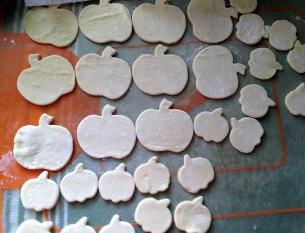 Cortar formas de calabaza como muchos como usted puede conseguir, hice 10 pequeños, 6 más grandes. No volver a rodar las migajas.