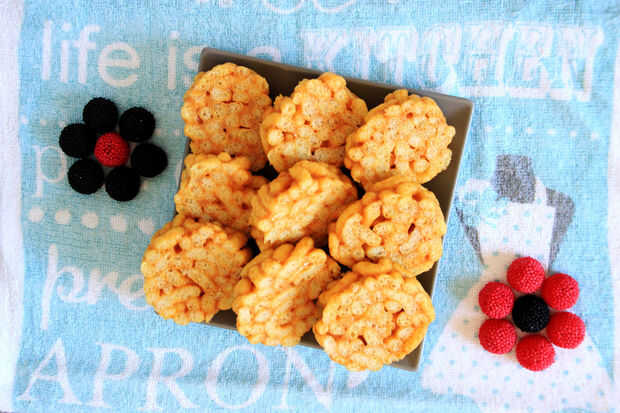 Primero derretir la mantequilla, añadir el caramelo, fusión y mezcla todo junto. Poner maíz puff a tazón de fuente grande, vierta la mezcla de mantequilla y caramelo y mezclar bien. Coloque la mezcla en papel de estaño, presione y gire. Refrigérala durante 2 horas. Corte rodajas de 1,5 cm de espesor. Disfrutar.