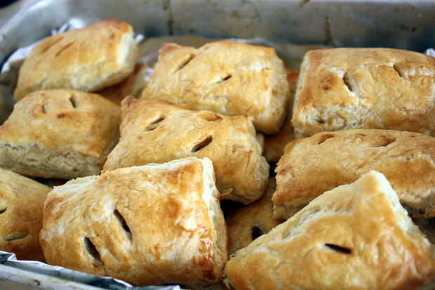 Doblar la otra mitad de masa de hojaldre sobre el relleno y presione cerrado. Corte 2-3 cortes por la parte superior de cada pasta.