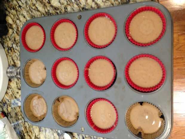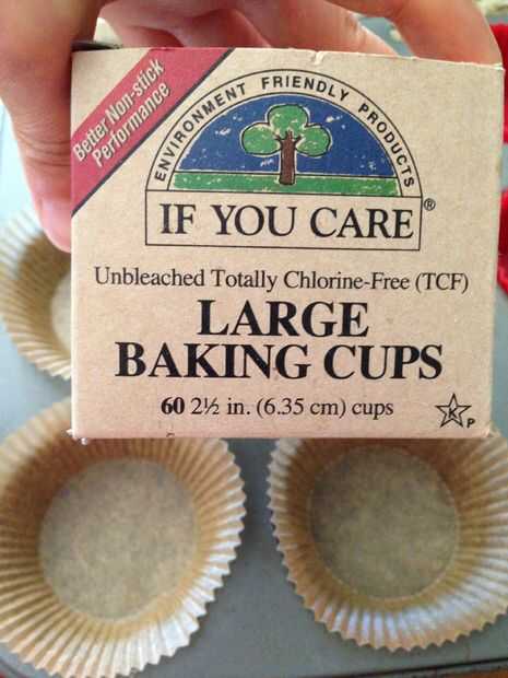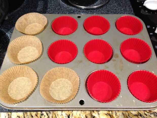 Línea su lata del mollete con tazas para hornear de silicona o algunas copas de buen papel antiadherente. Utilicé una combinación porque me quedo sin la silicona de los. (Ambos trabajaron muy bien en no pegarse a los cupcakes, pero la silicona que tenía una mejor forma).