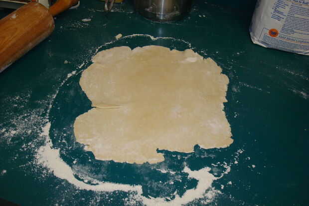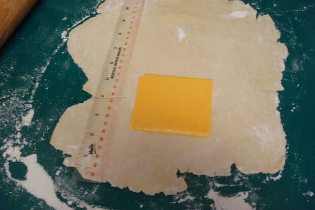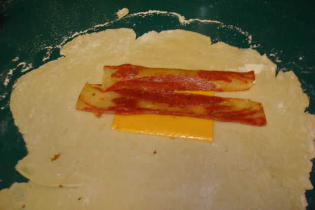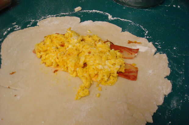 Rodillo la masa de galleta a 3 manos largas y 2 manos de ancho. Una vez que usted necesita para llenarla, primero que colocar el queso en el centro de la masa, luego que el tocino y superior el tocino con los huevos (no tiene que ser en ese orden). Cuando la Pastie es completo necesitará doblar la otra mitad de la masa por encima, prensar los bordes en los lados juntos para que juntos se queda bien.
