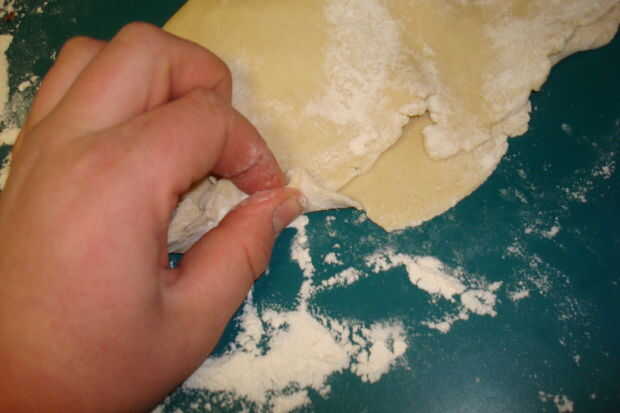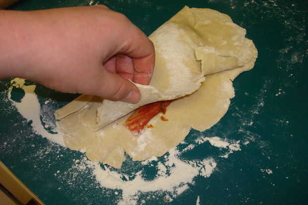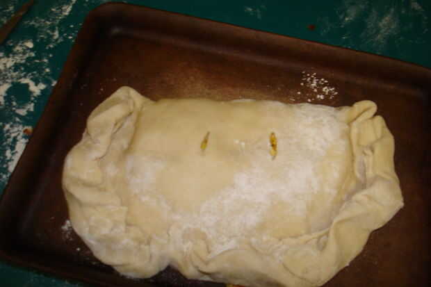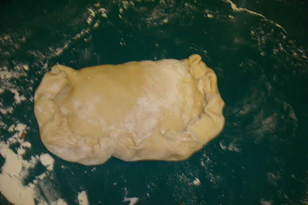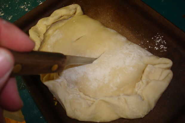 cuando la Pastie es completo es necesario doblar la otra mitad de la masa encima, prensar los bordes en los lados juntos, por lo que permanece juntos bien. antes de colocarlo en el horno, asegúrese de que poner los agujeros de aire en la parte superior