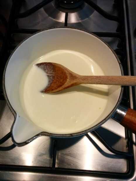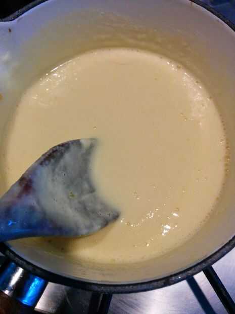 Calentar la crema hasta hervir. Mezclar los otros ingredientes bien en un bol y cuando la crema se pone a hervir Vierta la crema en el recipiente con los demás ingredientes y mezclar. Luego verter en la sartén y lo calientan suavemente todavía revolviendo hasta que espese la crema.