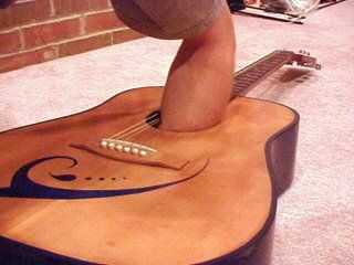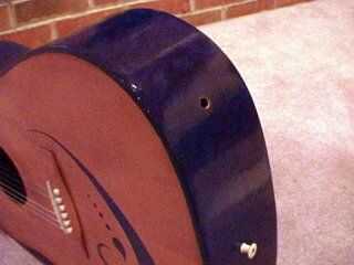 Limpiar cuidadosamente los bordes del agujero, se muestra en la figura 3. Tomar la arandela y la tuerca en el conector de 1/4". Ahora debes alimentar al gato en el cuerpo de la guitarra y directa hacia el agujero que ha perforado. Dependiendo del tamaño de su mano, puede que necesite quitar las cadenas completamente para conseguir su mano lo suficiente para guiar a la toma hacia el agujero. Usualmente solo aflojar las cuerdas, (muy flojas) y apriete mi mano cuanto sea posible, como se ve en la figura 3b. Es casi seguro que usted no será capaz de alcanzar el agujero. Esto está bien. Sólo ser paciente y mantener la pesca para él. Usted puede encontrar útil usar algo como un clip o un lápiz para ayudar a guiarlo a través del orificio. Una vez que es a través de la arandela y la tuerca vuelva a colocar el gato para mantenerlo en su lugar. No apriete demasiado la tuerca. Hacer demasiado flojo y saldrá... Hacer demasiado apretado y tienes una guitarra con una grieta en ella... Un poco suelto es mejor que demasiado apretado! Si usted está preocupado acerca de la fuerza del gato en el lado de la guitarra, usted puede hacer fácilmente una arandela de metal de hoja para el interior de la guitarra para ayudar a apoyarlo.