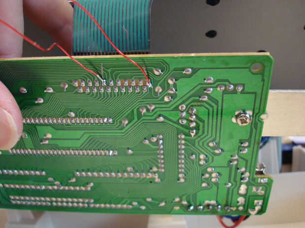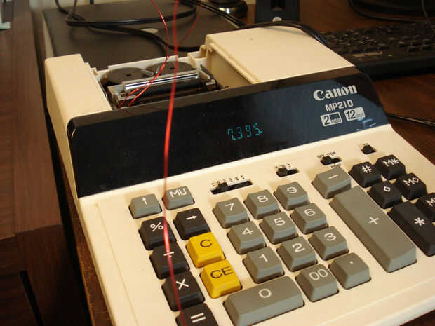 Luego tomamos una calculadora vieja aparte y cablear el interruptor reed al botón PLUS en la calculadora. Después de soldar dos cables a los contactos del botón PLUS, la calculadora ahora interpreta la caña cierre interruptor como un golpe en la tecla PLUS. Cada vez que pasa el imán, la calculadora funciona como que pulse la tecla PLUS. Simple y eficaz.