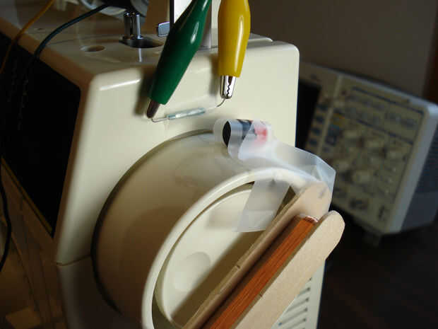 Queríamos algún modo automatizado de conteo de las vueltas de alambre. Naturalmente, utilizamos imanes para solucionar el problema. Nos une un solo D68PC-RB rojo y negro imán del cilindro para el husillo de la máquina de coser. El imán gira con la rueda.