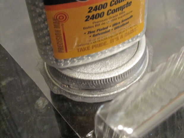 Coloque la tapa boca abajo sobre el plástico, con el BB del interior.  Entonces aplique una tira de pegamento fuerte del arte a lo largo del borde.  Usé el contenedor de BB para mantenerlo en su lugar y permitieron el pegamento se seque durante el periodo necesario.