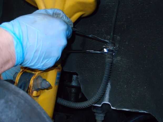 Lugar el aceite coger pan debajo de la conexión de la manguera de freno. Coloque una llave en el lado del coche de la conexión y una llave en el lado de la manguera. Sostener la llave en el lado del coche todavía mientras que girar la otra llave. Esto evita que la manguera o tubo en el lado del coche se dañe. Después de que se ha anulado la conexión de la manguera debe ser libre. Puede haber un clip de resorte sostiene la manguera en su lugar, que puede ser sacando solo el clip. Puede tomar un conjunto de pinzas o alguna palanca con un destornillador.