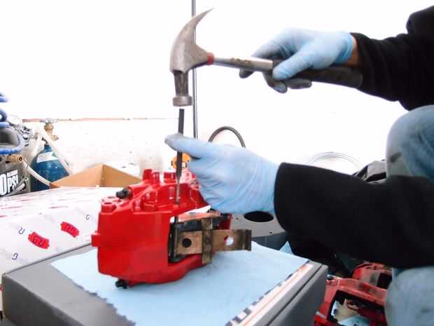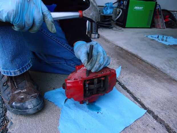 Las zapatas de freno se llevan a cabo en la pinza con dos pasadores y un clip de resorte. Usar el martillo y punzón (o destornillador) para quitar con cuidado los dos pernos de la pinza. Encontrar el lado pequeño del perno del martillo en, de lo contrario usted está sólo romper más en la pinza. El primer pin que eliminas liberará la tensión de la pinza de resorte, así que prepárate para que el controlador punch o tornillo conseguir un poco enredado.