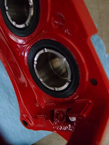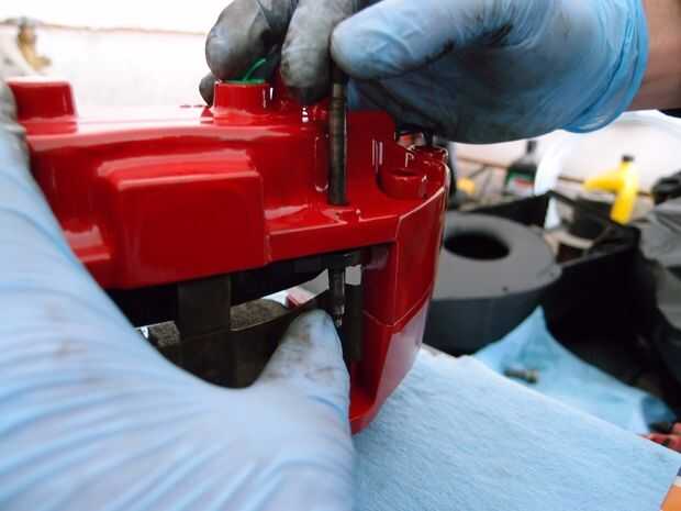 Se separó un poco de lubricante de pastillas de freno en la parte posterior de las pastillas de freno. Algunas pastillas vienen con pegatinas de plástico, pero te recomiendo que uses el lubricante también. Este lubricante evita las almohadillas chillando cuando que vibran entre los rotores y pinzas.