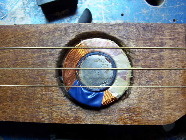 ahora aquí está recogida en el solenoide que hice para la guitarra slide de 3 cadena que se han ofrecido en este sitio un tiempo atrás. (no quitarlo para ver más de cerca como su hotglued en su lugar y no quiero romperlo) pero es una bobina que se encontró en las paletas de filtro de una impresora de la foto de una vieja hora {sé que basura no es común pero bobinas de cobre están en todas partes} un imán de un altavoz estéreo del coche viejo se ha posicionado en el centro de {envuelto con un poco de cinta de vinilo para hacer un ajuste apretado agradable}