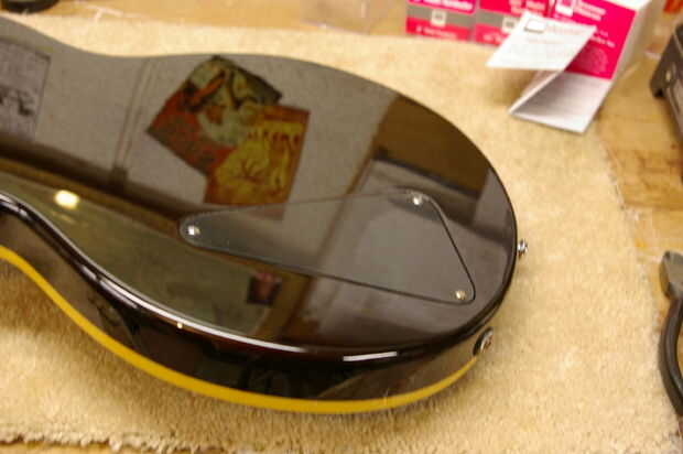 Lo primero que quieres hacer es quitar las cuerdas. Para la mayoría guitarras con el puente tune-o-matic y la cola parada, se deben eliminarlos así. Los de esta guitarra fueron en muy cómodamente y permanecieron en su lugar todo el tiempo... Pero siempre ten cuidado, estos pueden caer fácilmente al quitar las cuerdas. No hay que rayar la superficie.