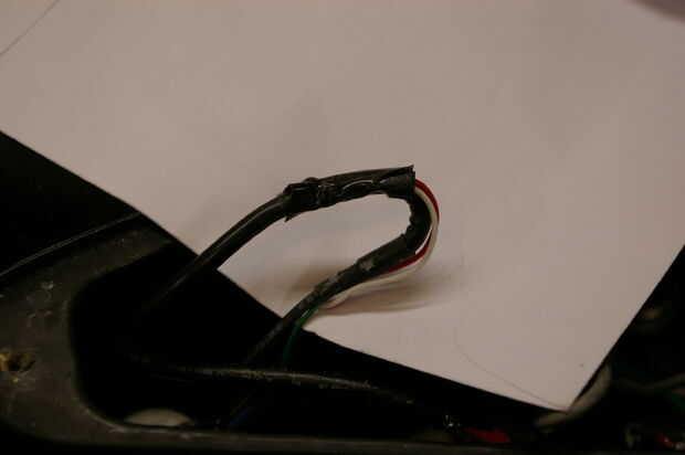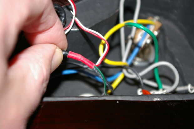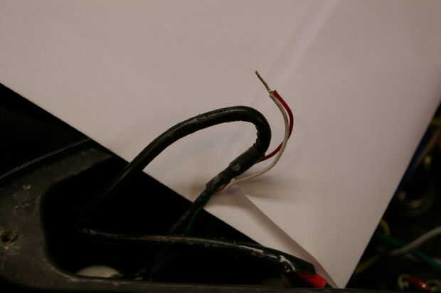 La meta aquí es entender lo que ya tiene y cómo está conectado... Así que parece que tenemos 4 hilos - blancos, rojos, verdes y negros. El blanco y el rojo fueron conectados juntos, el verde fue al estirón de la soldado en la olla y el negro fue soldado en la parte trasera de la olla.
