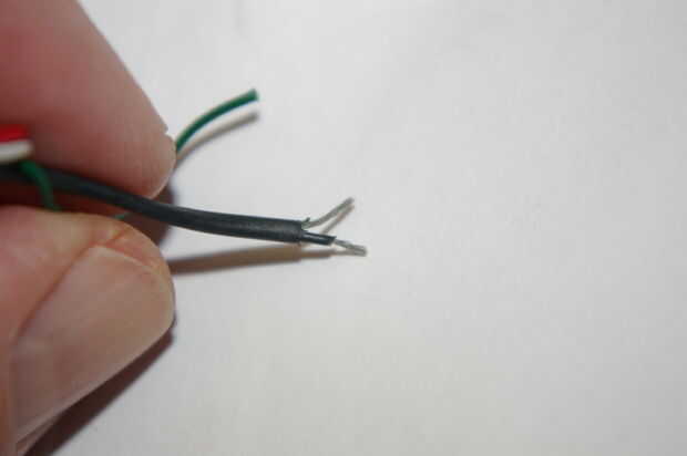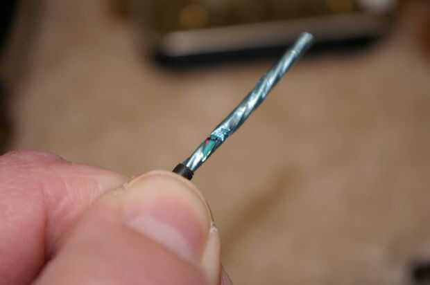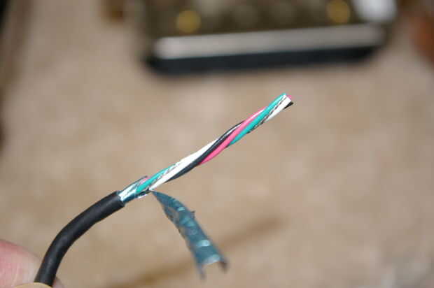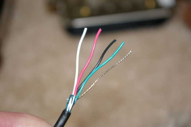 Ahora se iniciará en los nuevos cables de recolección. Se trataba de goma envuelto y usé un pelacables sencillo para sacar esta vaina externa. Sólo tener realmente cuidado con sacar la vaina, no desea dañar el aislamiento de los cables en el paquete. Puede usar pequeñas manicura Tijeras, tenazas, cuchillas de afeitar, etc. - sólo no se cortan los alambres (o dedos).