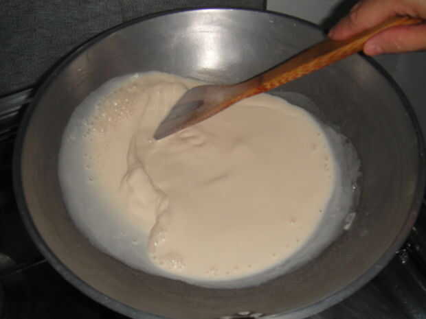 En la cocina cacerola hervir la leche evaporada hasta que vea la evaporación en el líquido. se puede ver alrededor de 3/4 izquierda del original.