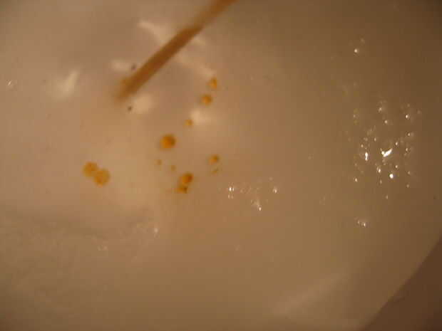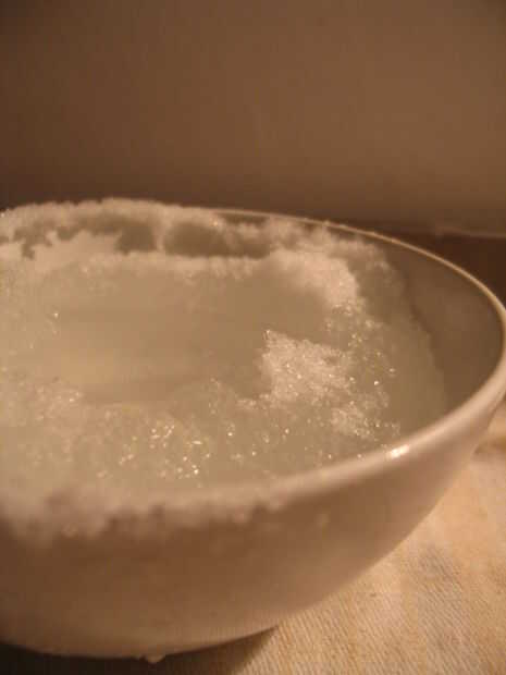 No tiene un termómetro de caramelo ni de hielo así que fue y consiguió algo de nieve y verter agua en el centro. En la segunda imagen vemos unas bolitas duras en mi snowater.