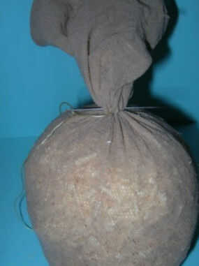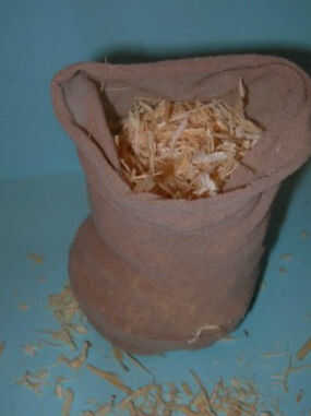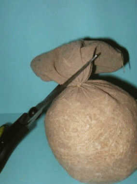 Rellenar la media con triturar madera y coser la parte superior del que le dan un aspecto redondo. Atar bien el hilo. Corte la parte restante de la media.