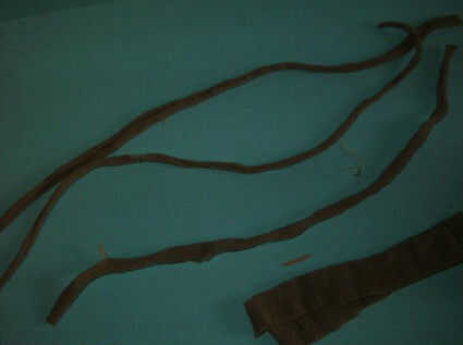 Tomar la parte restante de la media que sólo cortar y prepara las tiras a utilizarlos más como las cuerdas