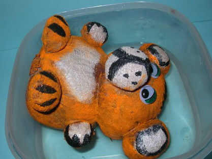 Fije los ojos saltones. Colocar el juguete pintado en agua durante unos 2-3 horas