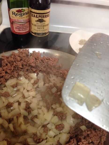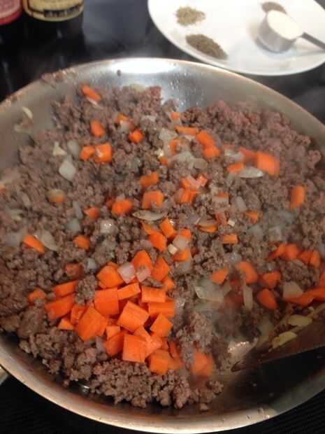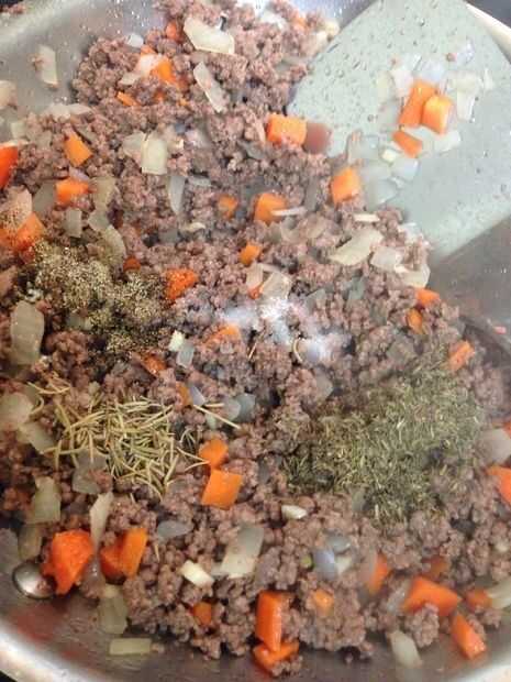 Dorar la carne en una sartén grande sobre fuego medio alto, escurrir el exceso de grasa. Hacer un pozo en el centro de la carne y agregue las cebollas, luego Vierta 1 cucharada de aceite encima de las cebollas y cocinar hasta que estén ligeramente transparentes. Hacer un pozo nuevo y poner el ajo en el centro y cocine hasta fragante unos 30 segundos. Añadir las zanahorias, tomillo, Romero, sal y pimienta y mezclar bien.