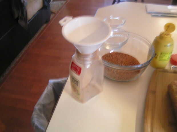 Entonces si eres tanto un reciclador como mi esposa es entonces usted tendrá algunos viejos contenedores de especia en el armario y hacen contenedores impresionantes para su frota varios y mezclas de la especia, use un embudo para obtener la mezcla frotar en el envase (también hace que los grumos de azúcar más fácil también) así que agite los diablos de mezcla más y conseguir la mayor parte de los terrones a.