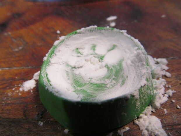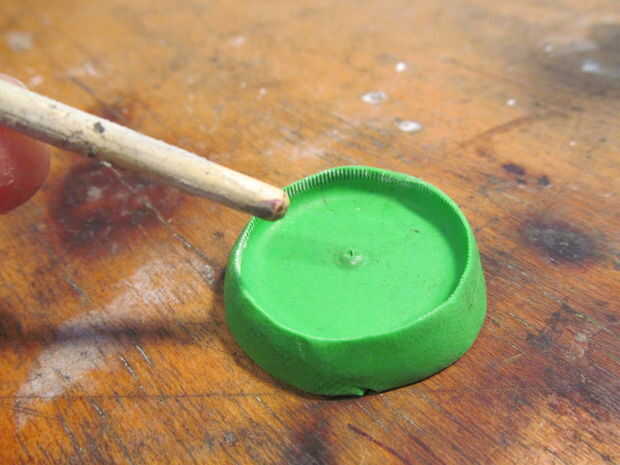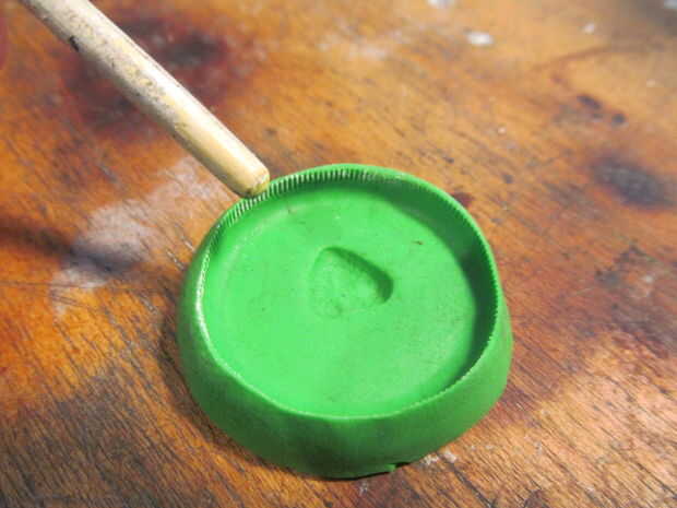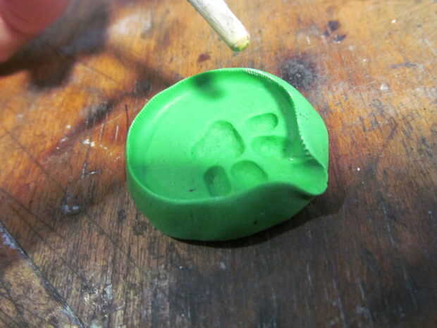 hice la huella de la pata usando la manija trasera de un pincel pequeño. Entonces cubrió la forma con el almidón de maíz y sopló hacia fuera. Esto ayuda a la fundida de la soldadura de flujo a través de.