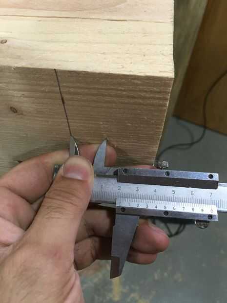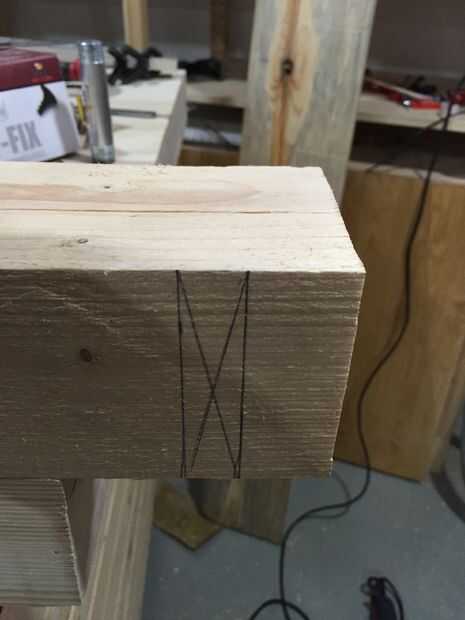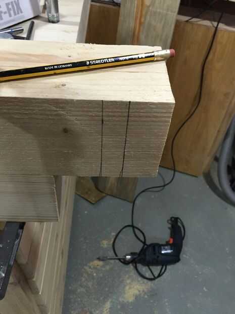 Las dos líneas son paralelas, y representan la más profunda y el lado menor de la entrerrosca de GI al pasar por el poste de madera de la pierna. De las dos líneas, es fácil discernir el centro para la perforación. (en el siguiente paso)