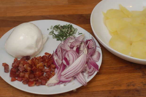 1 patata pequeña pelada y muy finamente en rodajas (un par de milímetros es mejor)