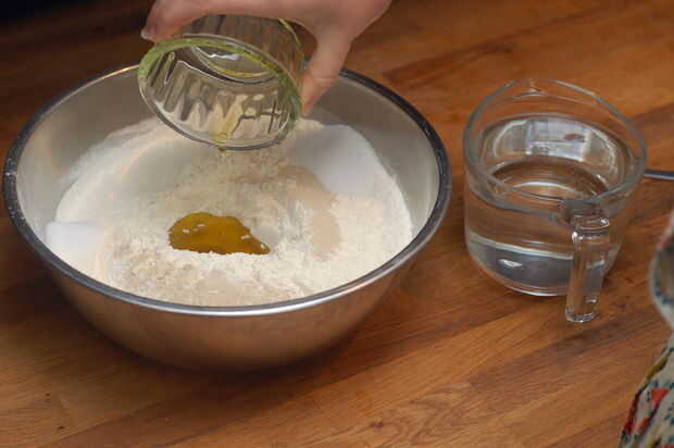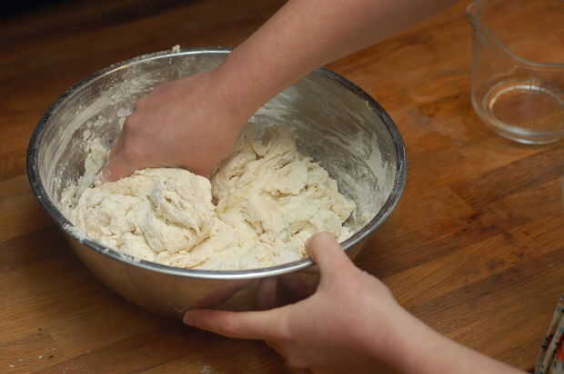 1. Poner todos los ingredientes de la masa seca en un tazón grande, hacer un pozo en el centro y vierta en el aceite, usando un cuchillo de la mantequilla o el inicio de las manos para unir los ingredientes. Gradualmente agregue el agua poco a poco, hasta tener una pasta áspera. No puede usar toda el agua o puede que necesite añadir un poco más. Amasar la masa entre cada adición.