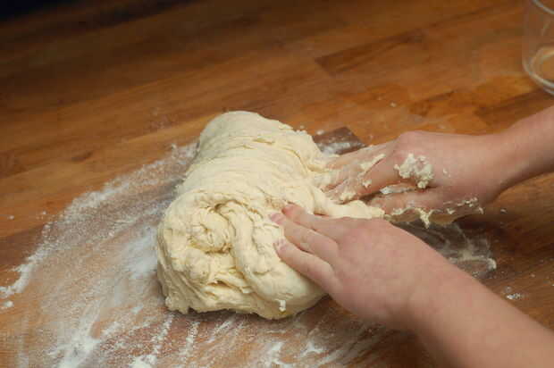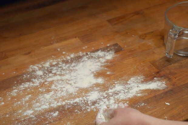2. Una vez que tengas una masa áspera resultan en una superficie ligeramente enharinada y amase durante unos 10 minutos o hasta que quede una masa elástica suave.