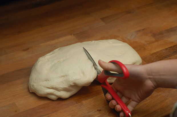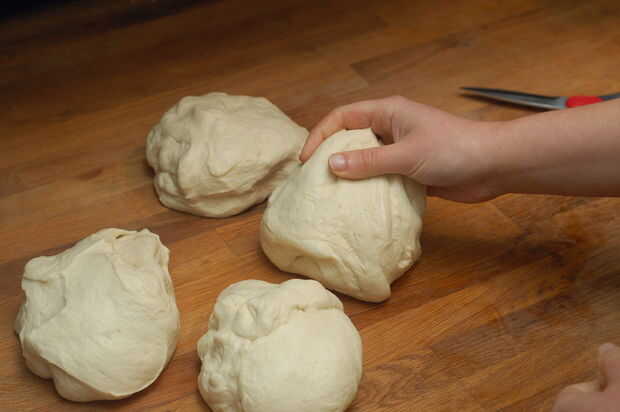 5. Una vez la masa ha aumentado Descúbrala, golpee nuevamente y dividir en el número de porciones. Que mina dividido en cuatro bolas. Una bola hará un 25cm deep pan pizza o dos pizzas de masa delgada de 25cm. Poner cualquier resto de la masa en la firdge si utilizando en los próximos días o usted puede congelarlo en bolsas de congelación.