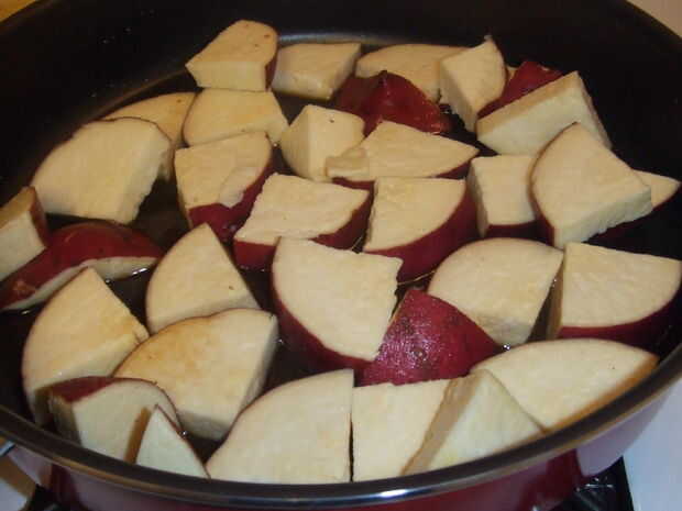 Paso 1: Lo que necesitará •la papaaceite de olivas•Knife•Spatula• amplia sartén•Brown azúcar * opcionalPaso 2: Preparar la patata dulce Pelar la batata si desea. Encontré que dejando la piel en hace más crujiente y masticable.Cortar formas largo y lu