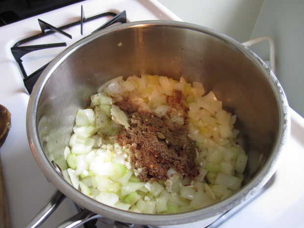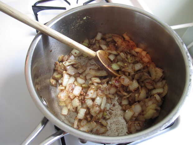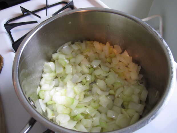Entonces, cae en la cebolla y el apio y cocinar, revolviendo frecuentemente, hasta que estén suaves y ligeramente translúcido.