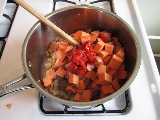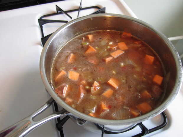 Finalmente, caer en patata dulce, pimiento rojo y guisantes eyed negro, revolver y luego cubrir con agua. (Hacerlo suficiente para cubrir. Generalmente tarda alrededor de 4 tazas para mí!)