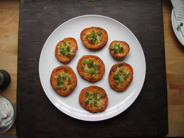 Organizar las rondas en un bonito plato y tapa con las cebollas verdes, el tocino y una cucharada de crema agria.