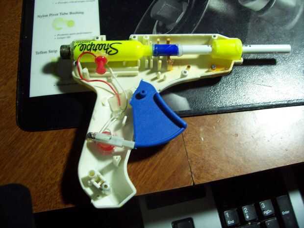 conectar todo el cableado del pizo a la cámara de combustión y haga clic en él. debería ver una chispa salta de los pernos. Si no entonces hacer que funcione. y la cámara de combustión y el barril nuevo hogar allí. NO PEGAR POR LO QUE SE PUEDE QUITAR A PISTOLA ERES LIMPIO. y no cortar el extremo del cañón. reducirá la energía de ustedes está el arma y no parecen una uzi ya.