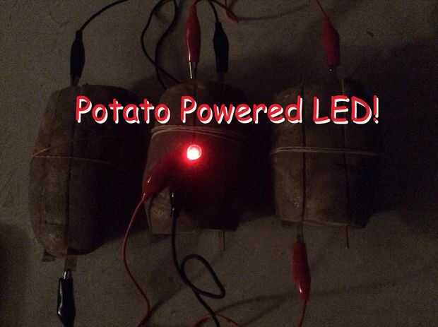 Cada papa de Zinc y cobre produce 1 voltio. En esta configuración particular, hemos creado 3 1 baterías de voltios conectadas en una serie que puede iluminar un LED.
